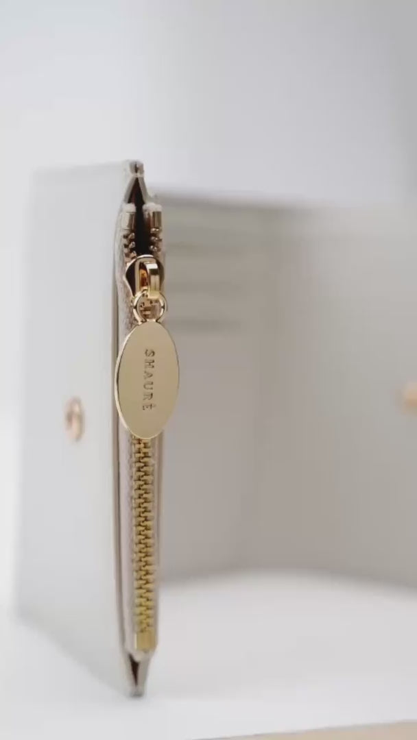 The Prana Wallet captures quiet sophistication in contrast  — where lamb-finish smooth off white MIRUM® enriched  with real rice hulls plays a gentle peekaboo with faded  espresso MIRUM® accents.